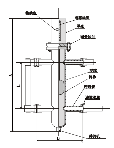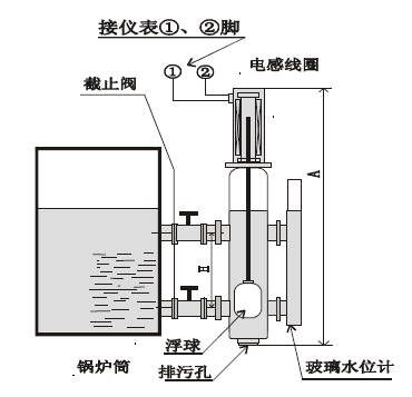 传感器液筒上的汽水管法兰与锅炉锅筒相连接,使锅筒内的水位与液筒内水位互相连通。当锅筒内水位变化时,液筒内水位相应发生变化。液筒内浮球根据水位高低而发生变化,水位升高时,浮球向上浮。水位下降时,浮球向下浮,连接浮球上的矽棒在电感线圈内发生位移,使电感线圈两端电感量发生相应的变化,这一变化的电感量送入二次仪表,二次仪表接收这一变化的液位信号,转换成与液平面相对应指示(显示)信号。