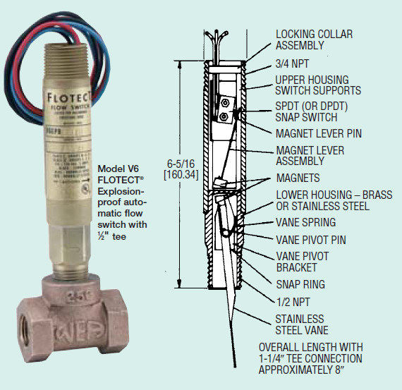 V6EPB-B-S-2-B-MT流量开关;黄铜上壳,黄铜下壳,黄铜带3/4英寸NPT连接的三通,SPDT快速开关和高温选项。