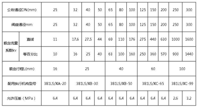 | 配用执行机构型号 | 381LS/XA-20 | 381LS/XB-30 | 381LS/XB-50 | 381LS/XC-65 | 381LS/XC-99 | |||||||