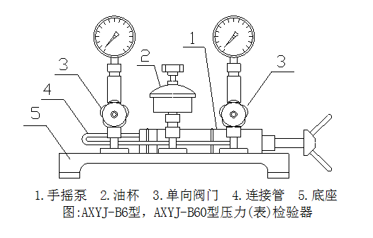 压力表校验器由手摇泵(1)、油杯(2)和两个单向阀们(3)组成,彼此用连接管(4)相连,彼此都固定在底座(5)上,阀(3)上装有两端锁母M20×15用以连接精密压力表和被校验的压力表。关闭油杯阀门,旋转手轮使活塞移动,由此而产生之压力(或真空)即可传至两个压力表;根据精密压力表的示值对被校验压力表进行检验。