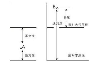 *压、表压和真空度的关系 A-测压点压强小于当时大气压 B-测压点压强大于当时大气压