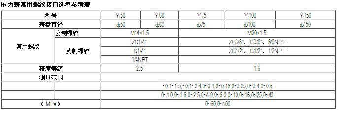 GB/T1226-2001《一般压力表》国家标准中规定,Y-40压力表的连接螺纹为M10×1,Y-60压力表的连接螺纹为M14×1.5,Y-100,150,200,250压力表的连接螺纹为M20×1.5。在用户无特殊要求的情况下,制造商将按标准规定提供相应螺纹规格的压力表。