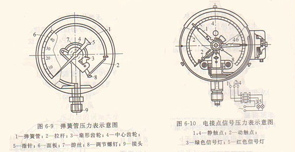 弹簧管压力表是一种指示型压力表,如图6-9所示。被测压力由接头9输入,使弹簧管1的自由端产生位移,通过拉杆2使扇形齿轮3作逆时针偏转,于是指针5通过同轴的中心齿轮4的带动而作顺时针偏转,在面板6的刻度标尺上显示出被测压力的数值。游丝7是用来克服因扇形齿轮和中心齿轮的间隙所产生的仪表变差。改变调节螺钉8的位置(即改变机械传动的放大系数),可以实现压力表的量程调节。