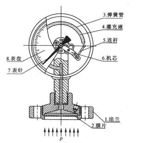 Y-M系列隔膜压力表由各种通用型压力仪表和不同结构的隔膜隔离器组成一个封闭系统,内充密封液。当被测介质的压力作用于隔膜时,则隔膜产生变形,压缩封闭系统中的密封液。由于密封液的固有性质,使压力仪表中的弹性元件产生相应的弹性变形一位移,经指示装置显示压力值。当隔膜的刚度足够小时,则压力仪表指示的压力就近于被测介质的压力值。