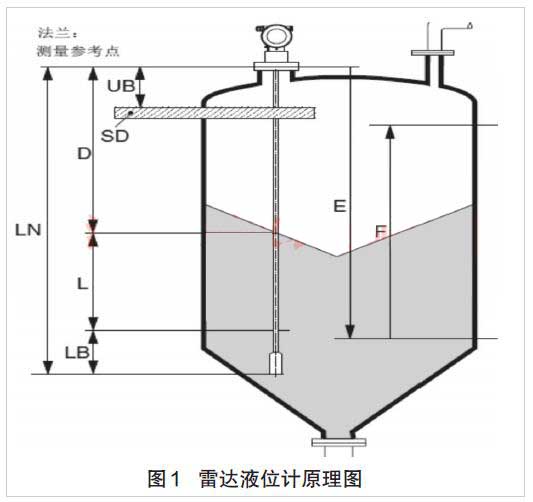 式中:D为雷达液位计到液面的距离;C为电磁波的速度;T为电磁波在发射-发射-接收过程中运行的时间,其雷达液位计的超高速计时电路可以*地测量出电磁波传导经历的时间,而电磁波的传输速度C为常数,即可计算出液面到雷达天线的距离D,从而知道液面的液位L=E-D,雷达液位计的测量原理如图1。