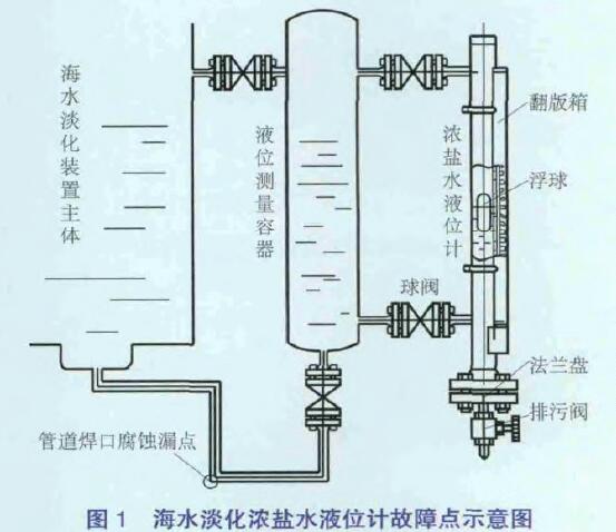 带热压缩器低温多效蒸馏海水淡化的浓盐水、蒸馏水及冷凝水液位测量都采用带远传的磁翻板液位计。为了防止结垢,需在低温的情况下让海水达到沸点,要求海水淡化装置内部处于负压状态,正常运行时为-0.093MPa 左右。现将磁翻板液位计在负压状态下发生管路漏气的典型故障进行分析。