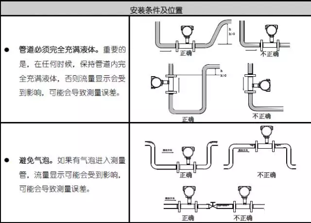 传感器应与管道同心,密封垫圈不得凸入管路。传感器不应再水平管线的高点,以免管线内聚集的气体(如停流时混入空气)停留在传感器处,不易排出而影响测量。