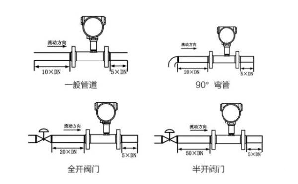 流量计上游端至少应有10倍公称通径长度的直管段,下游端应不少于5倍公称通径的直管段,其内壁应光滑清洁,无凹痕、积垢和起皮等缺陷。传感器的管道轴心应与相邻管道轴心对准,连接密封用的垫圈不得深入管道内腔。不同情况下的直管段要求如下图。