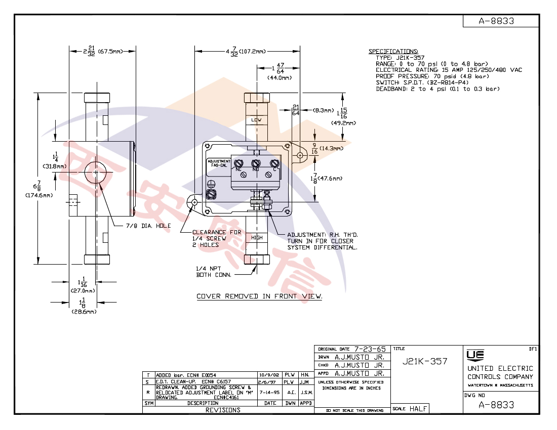 J21K-357美国UE差压开关 0-4.8bar 防腐开关