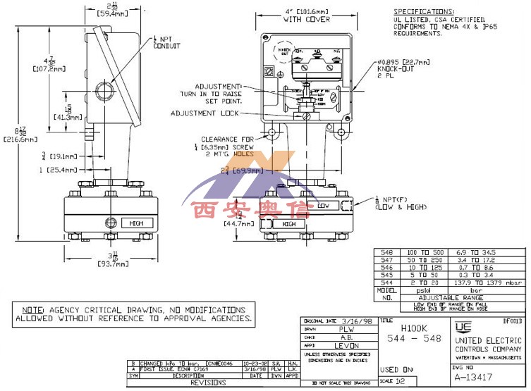 0.7-8.6bar美国UE差压控制器H100K-546-M201美国UE差压开关 工作原理 工作原理为纯机械形变导致微动开关动作。当压力增加时,作用在不同的传感压力元器件(膜片、波纹管、活塞)产生形变,