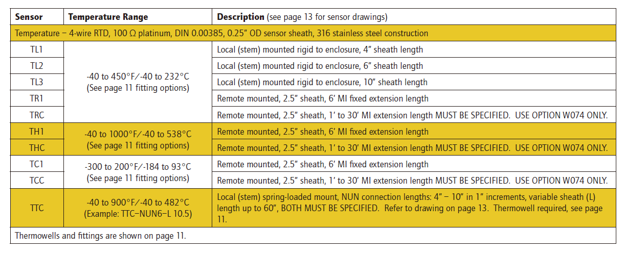 温度型号: 316L不锈钢材质,6.4mm(0.25”)外径套管,包含一个100 ohm 4线