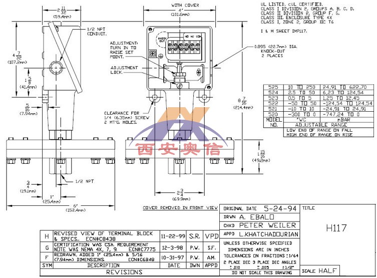 | H117-520 | -746.7-0mbar | 0.5-19.9mbar | 13.8bar | 27.6bar | 定睛橡胶膜片及O型圈 | 1/2NPTF |