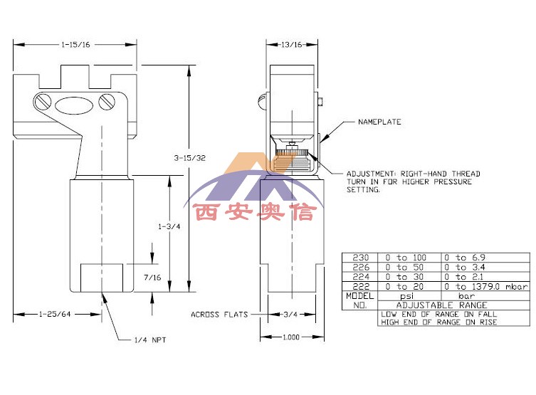 | 230 | 0-6.9 bar | 1-2.3 bar | 7.6 bar | 1/4”NPT内 |