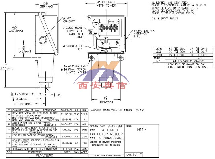 H117-361压力范围:1.4-20.7bar 回差:0.6-1.5bar 工作压力:20.7bar 焊接316L不锈钢