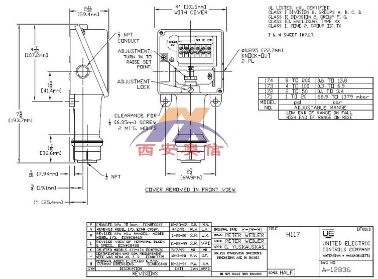 H117-173参数: 焊接316不锈钢膜片 压力范围:0.3-6.9bar 回差:6.9mbar-0.7bar