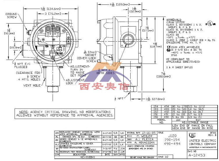UE全国 J120-492 美国UE开关 防爆压力开关 316不锈钢膜片 1.0-20.7bar