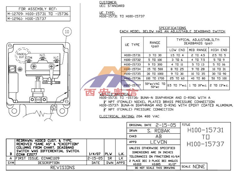 美国UE压力开关 美国UE UE温度开关 UE差压开关 UE炉膛负压开关 UE高压开关 UE微压开关 H100-15737