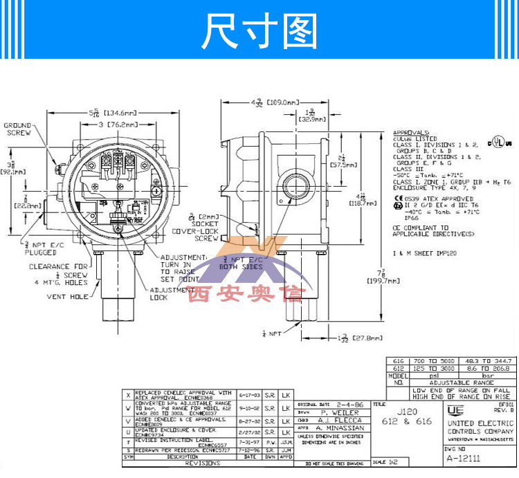 J120-612-M540 设定范围8.6-206.8bar 303不锈钢活塞 氟橡胶O型圈 1/4NPTF过程接口 耐压 689.5bar
