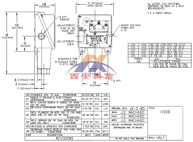 压力开关 P/N:H100-190 OPTIONS: M405 压力范围:5-30psi ,*大压力:1500psi