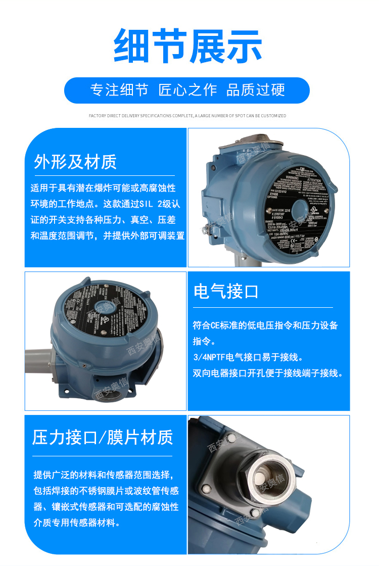 防爆压力开关是以高精度压力传感器作为检测元件,用高稳定电路产生开关信号,实现压力连续测量和开关量控制。具有精度高,迟滞小,响应快,性能稳定可靠,体积小,易操作和安装简便灵活的优点。 防爆压力开关可以提供不同的压力,差压,真空和温度范围,同样可以提供不同的连接方式,各种不同的材料以及感压元件类型,正是由于这种灵活的选择方式使得防爆压力开关可广泛应用于各种场所,如化工、石化、炼油、油田、钻井平台,输油管线以及制药等各种工业过程。