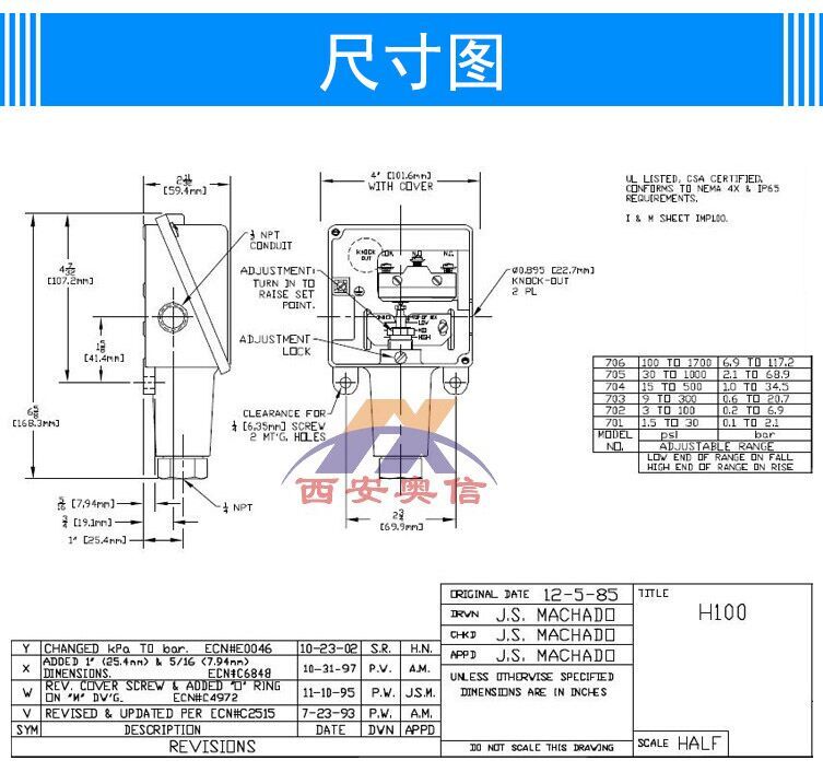 M278 铭牌上的设定点范围用Kg/cm2表示;不适用于温度开关;