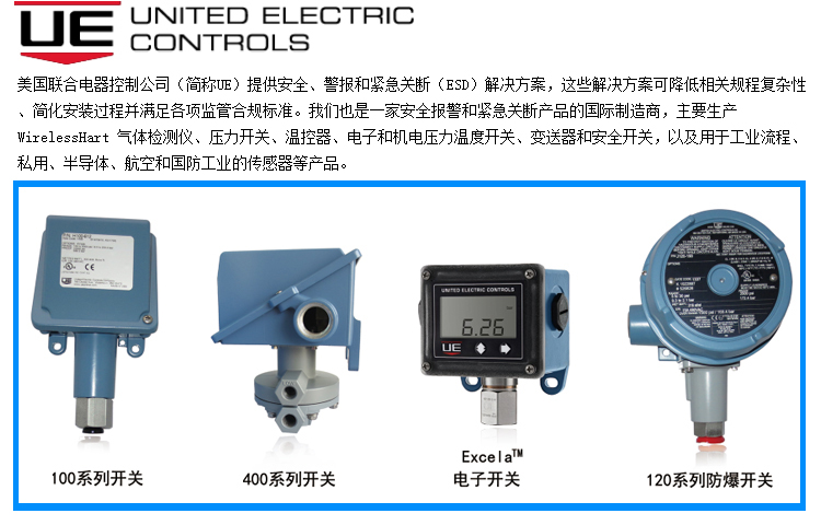 UE品牌压力开关/温度开关/差压开关以性价比高的优势,近几年很快占领了国内大部分电厂,化工厂,石化行业等,应用广泛,在汽轮机,锅炉,压缩机,泵的控制方面性能稳定,重复性设定稳定达到了1%甚至0.5%以上,在一些检修过程中,大量的替换原来的*品牌开关,比如*替换SOR,CCS,长野,太平等。并且市场价格稳定,更得用户的认可。