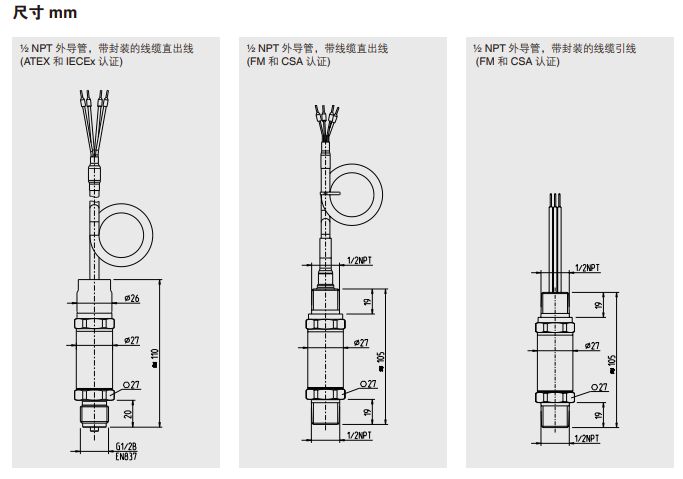 这两款压力变送器符合 FM 和 CSA *的危险区域 1 区 I 类、II 类 、III 类“隔爆”标准,同时还符合 ATEX和IECEx*的II 2G Ex db IIC T6...T1 Gb“隔爆”标准。