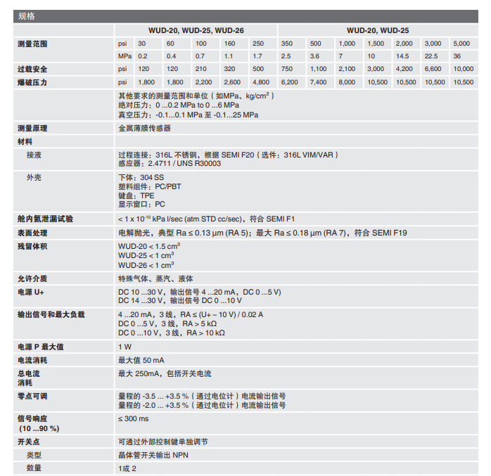 德国威卡介绍WUD-20高纯传感器WUD-25压力变送器WUD-26德国wika 德国威卡WUD-20高纯传感器描述 可靠 WUD-2x系列高纯传感器将先进的传感器理念与模拟输出信号相结合,能够为当前
