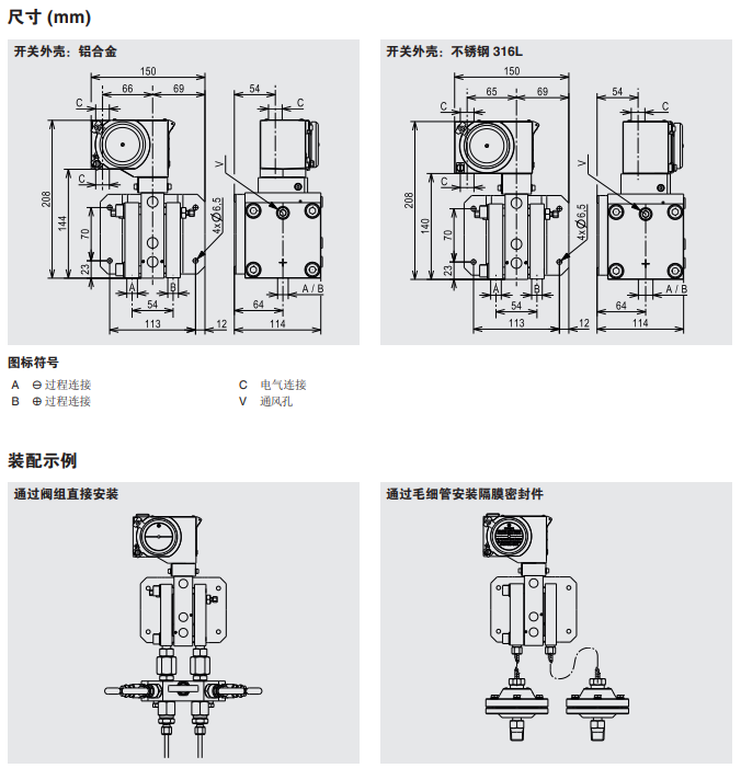 过程连接的中心距为54mm,径向安装时可以简单的安装一个标准的阀组。