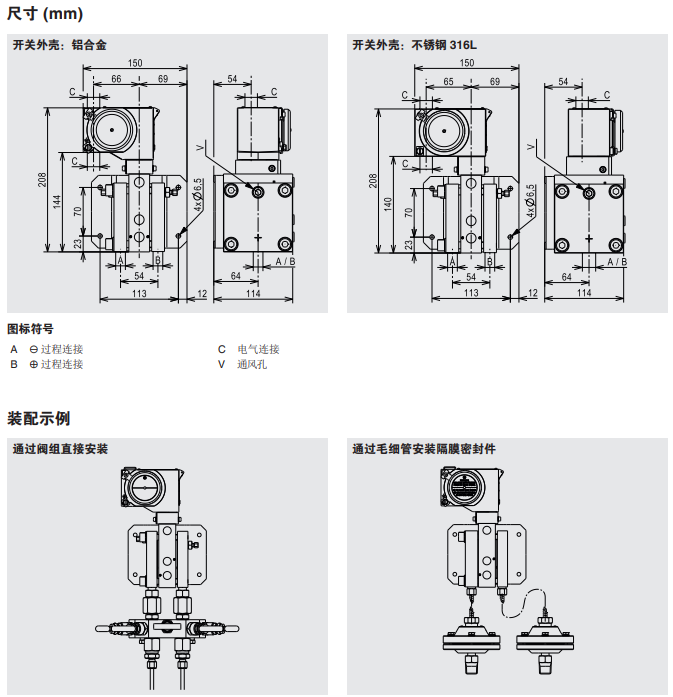 过程连接的中心距为54mm,径向安装时可以简单的安装一个标准的阀组。