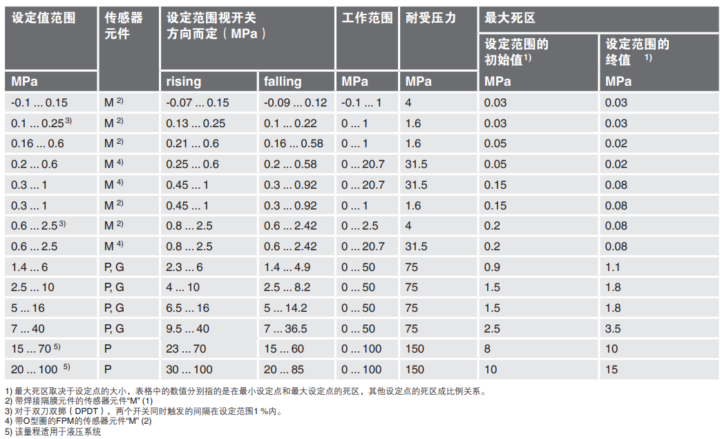 设置范围:0.1 ... 0.25 MPa 至 20 ... 100 MPa