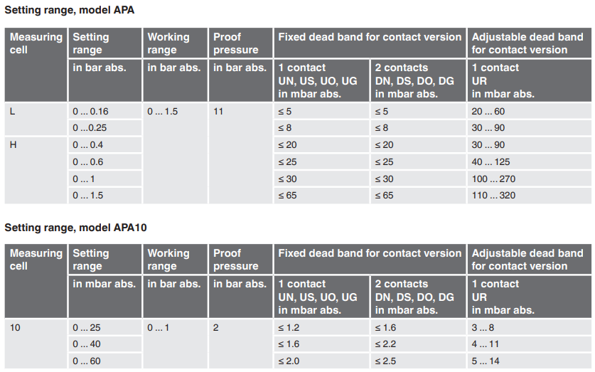 APA型绝压开关采用了膜片测量系统,坚固耐用,实现了出色的操作特性和测量性能,且重复精度小于1%。
