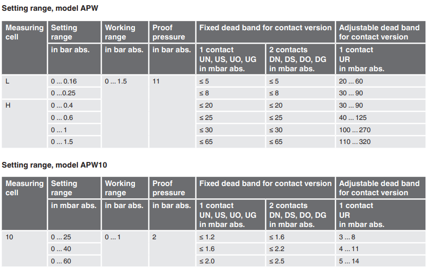 APW绝压开关是对高安全性能应用而研发。符合* 产品制造标准,可实现可靠监控。在生产中,开关在每个步骤都经由质量管理软件跟踪记录,而且在成品后经过了严格的测试。所有接液部件均使用不锈钢作为标准材料。