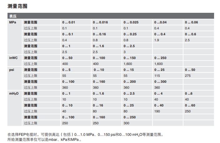 投入式压力变送器(带FEP电缆):长达100 m(328英尺)