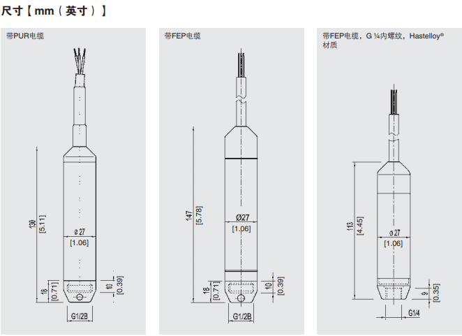 投入式压力变送器: 约200 g (0.44 lbs.)