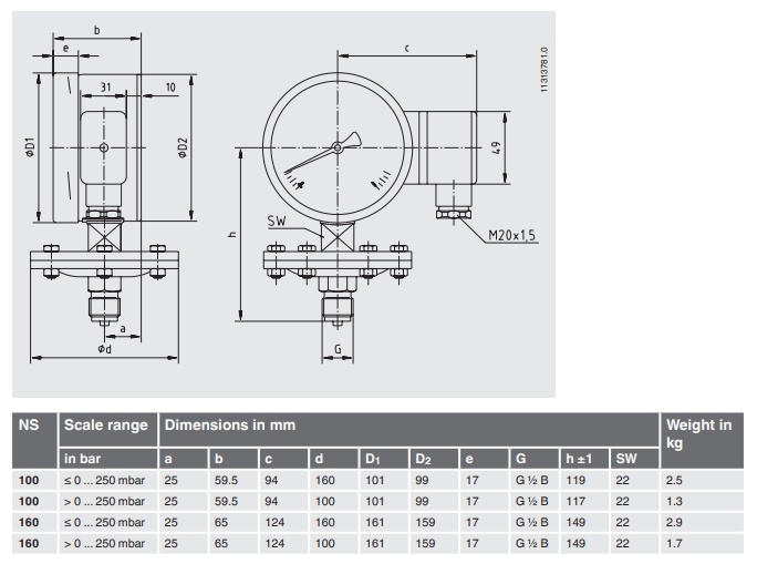 压力范围: 0 ... 16 mbar to 0 ... 250 mbar (flange Ø 160 mm) 0 ... 400 mbar to 0 ... 25 bar (flange Ø 100 mm)