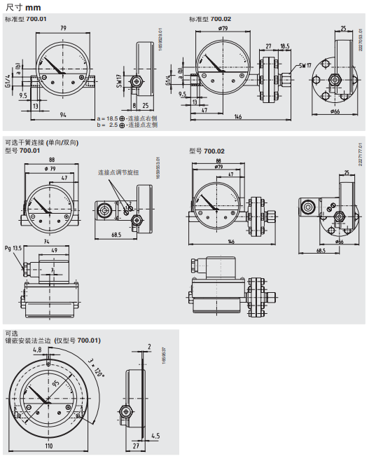 700.01型很适合用于差压监测,即使在气体和空气制备及系统的高压环境中也同样可以胜任。带隔离膜片的700.02型适用于液体介质,因此很适合用于水处理与系统。700.01型可配备正面安装法兰。