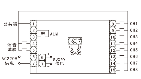2. 输出信号:八点发光报警指示,具有音响接点输出报警,音响动作为接点闭合。