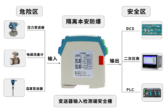 产品给危险区的变送器提供电源,变送器产生的电流信号隔离转换成对应的线性电压或电流信号输出至*区,或通过RS-485通迅、开关量输出方式隔离传输至*区,并可给危险区的变送器提供隔离电源,该产品需独立供电,输入/输出/电源三隔离。可用在二、三线制变送器设备。