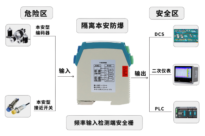 产品可给现场危险区仪表提供12V或24V的隔离电源,危险区仪表产生的频率信号通过*栅隔离传输到*侧输出。输入具有较高的抗干扰性能。该产品需独立供电,输入/输出/电源三隔离。本产品可用在频率信号源等设备。