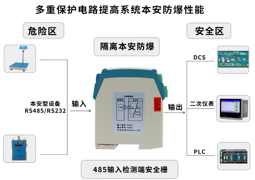 产品可实现RS-485数字信号在危险区和*区的双向通信,也可将其转换为RS-232数字信号隔离传输到*区,该产品需独立供电,输入/输出/电源三隔离。本产品可用在带有RS-485通迅接口的设备。