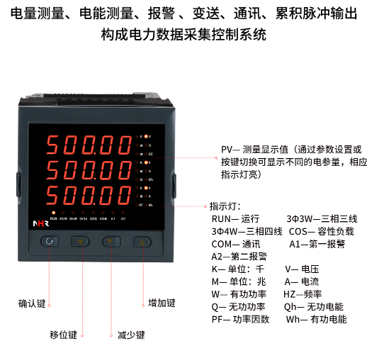 可直接采集三相交流电压、三相交流电流信号,将其转化为三相有功功率、三相无功功率、三相视在功率、三相功率因数、三相工频周波、三相谐波及四象限电能的测量